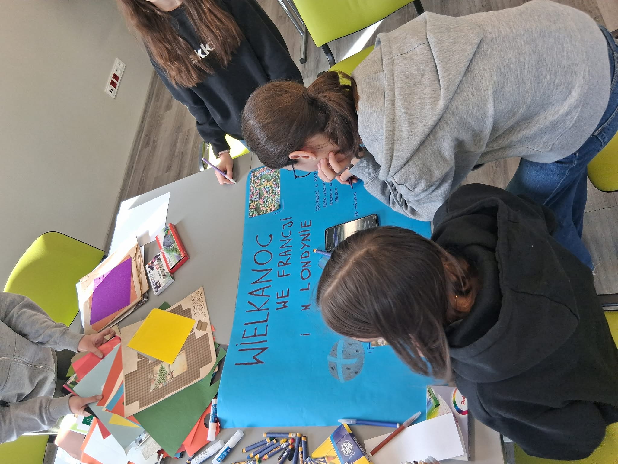 Na zakończenie spotkania dziewczyny przygotowały plakat przedstawiający wybrane tradycje wielkanocne we Francji i w Londynie. Powstała praca była różnorodna, kolorowa i bogata w ciekawostki, co świadczyło o dużym zaangażowaniu uczniów oraz efektywnym wykorzystaniu nowych technologii w procesie nauczania.