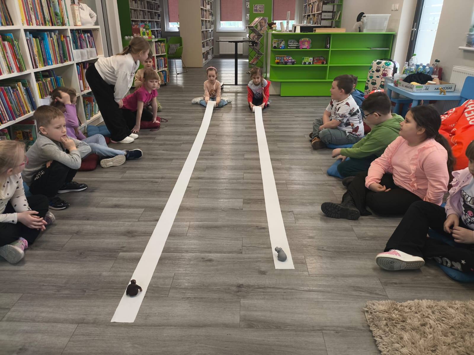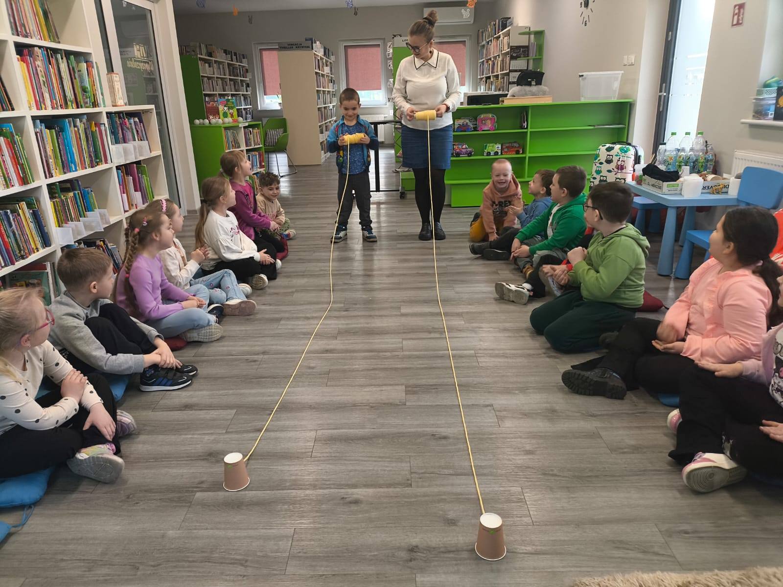 W drugiej części zajęć zorganizowano zabawy zręcznościowe. Dzieci uczestniczyły w różnych aktywnościach ruchowych, takich jak rzucanie do celu, przenoszenie przedmiotów czy pokonywanie prostego toru przeszkód. Zabawy rozwijały koordynację ruchową, sprawność fizyczną oraz umiejętność współpracy w grupie.
