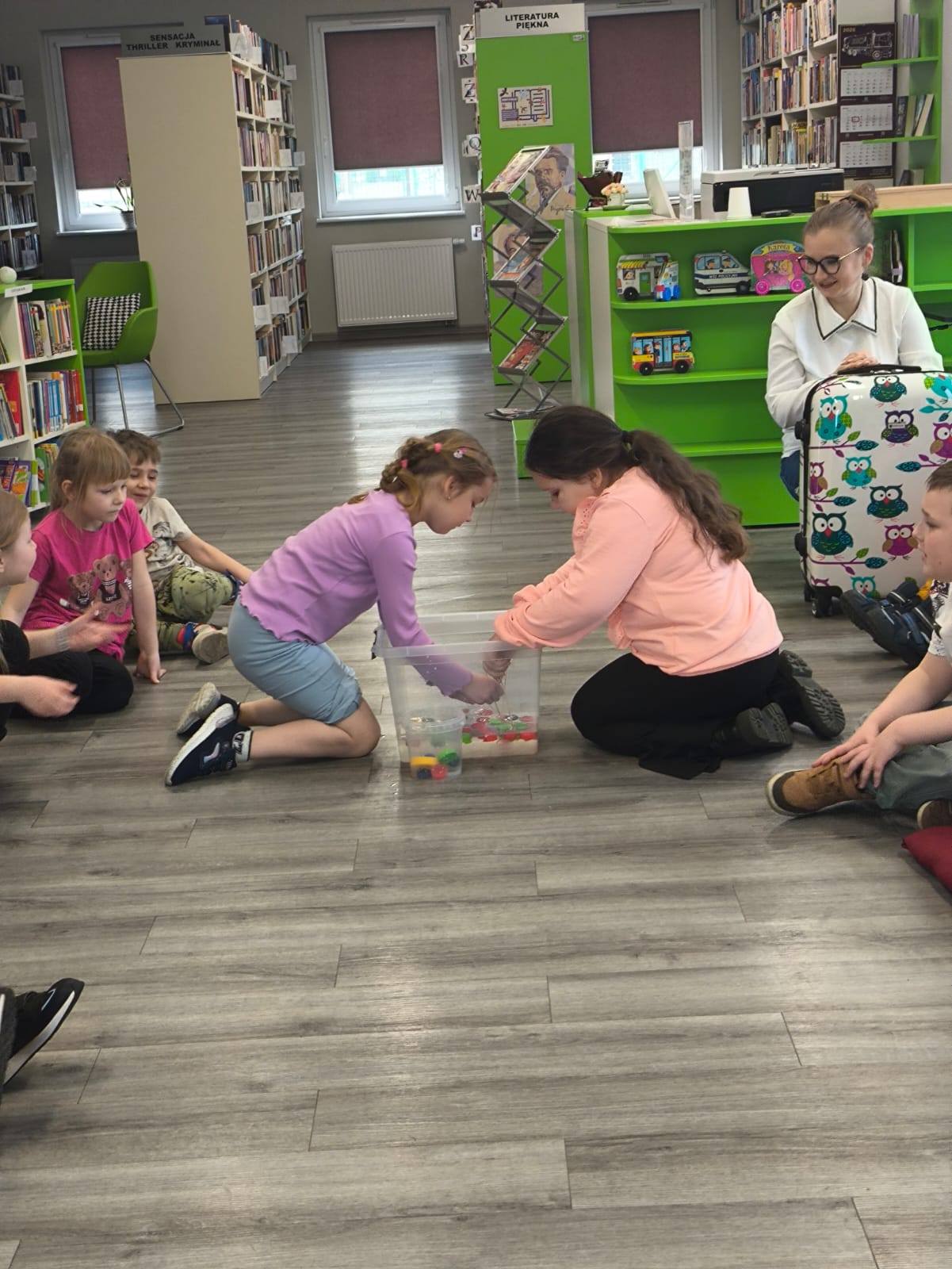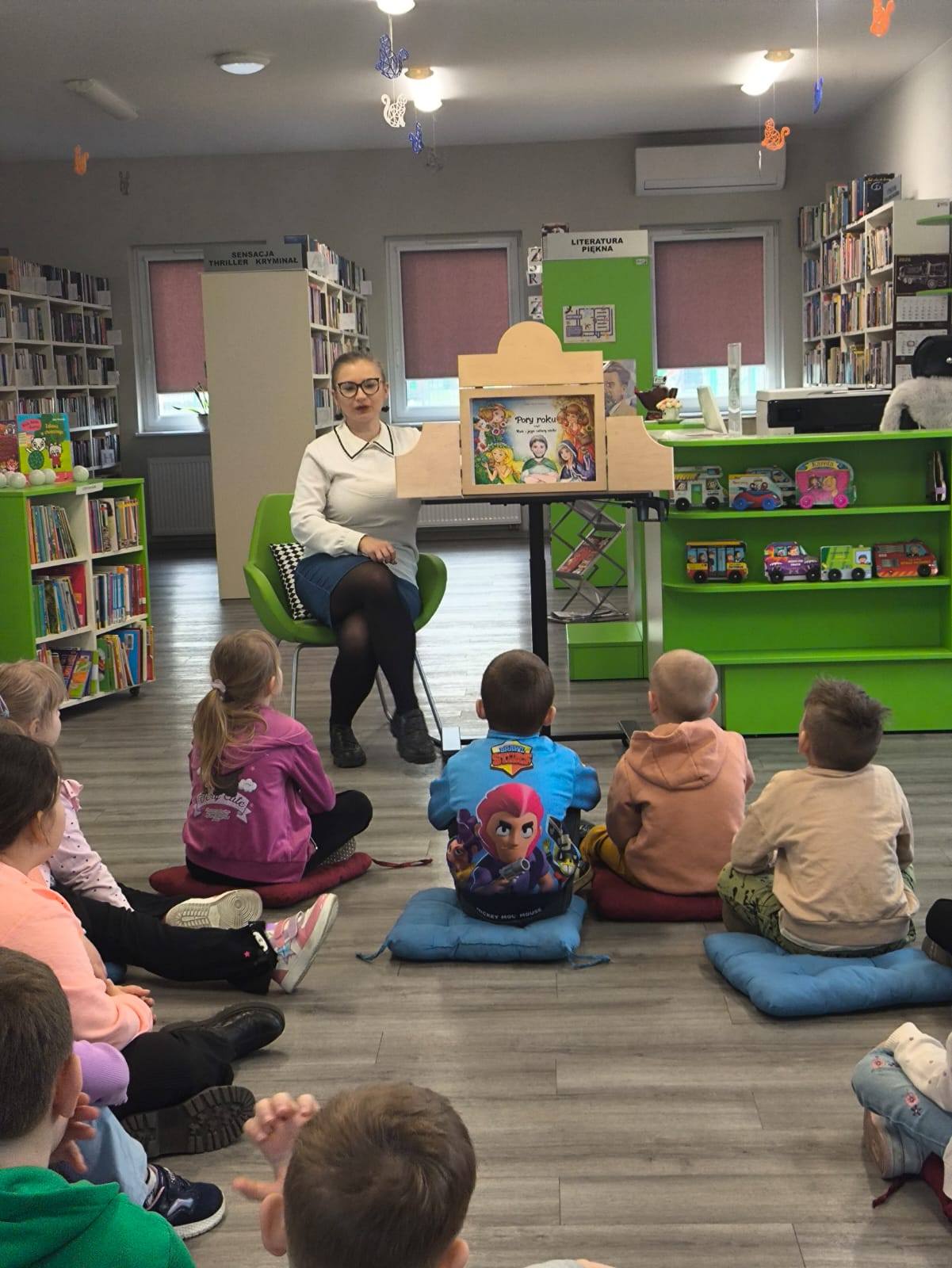 Zajęcia rozpoczęły się od rozmowy wprowadzającej na temat pór roku. Dzieci dzieliły się swoimi doświadczeniami i opowiadały, z czym kojarzy im się wiosna, lato, jesień i zima. Następnie bibliotekarz przeczytał bajkę o porach roku w teatrzyku kamishibai. Podczas czytania dzieci z dużym zainteresowaniem oglądały ilustracje i uważnie słuchały opowieści, reagując na pojawiające się w historii wydarzenia oraz bohaterów.